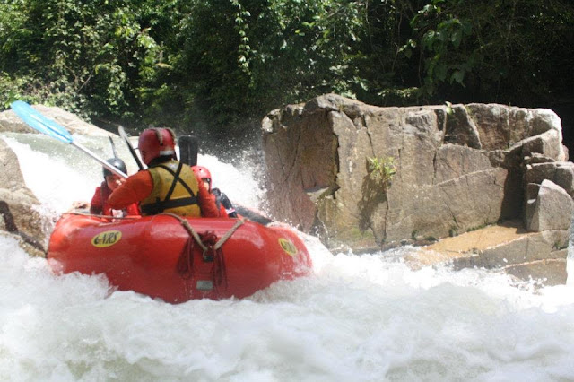 Tapi sumpah seribu kali sumpah, termakan pujuk rayu member-member untuk pergi lagi skali, tapi kali ni kat Slim River. Kat Slim River ni Grade 3 rasanya. It was fun and smooth sebab tak banyak halangan yang scary. The famous jeram kat Slim River ni is Jeram Kotak (picture below). Haaa, turun-turun terus cium batu besar bentuk macam kotak kat tengah tu. Jantung dup dap dup kalah jumpa hantu! Luckily our raft berjaya mengharungi Jeram Kotak ni. Ada satu raft biru ni, one of their member tercampak keluar! Ahhh, takotnya kalau benda tu jadi kat diri sendiri.